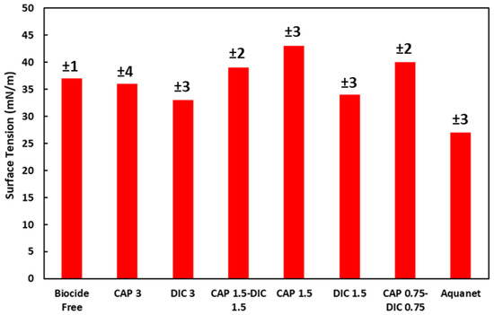 The surface tension of the coatings developed in this study was found to be between 33 and 40 mN/m (Figure 3), with the water contact angles exceeding 75°, indicating a good water repellence [28] that could have a significant role in the coating quality and aging properties.