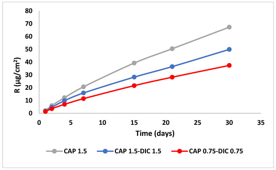 Cumulative release of capsaicin per area (R, in μg/cm2) from antifouling coatings CAP 1.5, CAP 1.5-DIC 1.5, and CAP 0.75-DIC 0.75.
