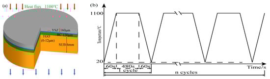 Hastelloy-X alloy of Φ25.4 mm × 6 mm was selected as the substrate. Before spraying, the samples were treated with 60 mesh white corundum sand to improve the bonding strength between the coating and the substrate. The bonding layer was obtained with a thickness of 130 μm using commercial Yttrium Nickel/Cobalt Chromium Aluminum (MCrAIY) powder prepared under the APS. The surface of BC was then blasted with low pressure and a small angle using 24 mesh, 36 mesh, 60 mesh, and 96 mesh of Al2O3, respectively. The burst pressure was 0.4 MPa. A working angle (the angle between the substrate surface and the nozzle axis) of 75° was considered ideal for sandblasting operations []. Finally, TC was prepared using 8 wt.% stabilized Zirconia with Yttrium Oxide (YSZ) to obtain a thickness of 160 μm (Figure 1a). The samples were designed to yield a variety of interfacial curvatures to allow for following investigations of oxide growth and internal stresses in the coatings. The equipment used for the preparation process was Praxair Model 3710 plasma arc spraying system and Model 2400 M six-axis manipulator. The four groups of the prepared samples were noted as No.1 (24 mesh sandblasting treatment), No.2 (36 mesh sandblasting treatment), No.3 (60 mesh sandblasting treatment), and No.4 (96 mesh sandblasting treatment). The spraying process parameters are shown in Table 1. The coating was subsequently tested using the heat treatment of Figure 1b.