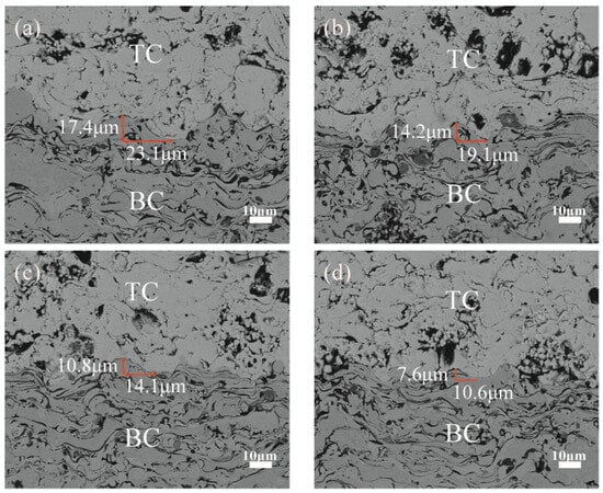 With the decrease of the sandblasting particle size on the surface of the treated bonding layer, there was a decrease of 1.8 μm–2.2 μm in the TC/BC interface amplitude compared with the previous set of samples, and a decrease of 3.5 μm–5.0 μm in the wavelengths of the oscillation cycles, which can be observed from Figure 2. It is tentatively indicated that the sandblasting treatment changed the interfacial morphology to a certain extent, which provides a reference for the subsequent study.