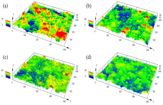 The 3D surface morphology of BC was measured by 3D laser microscopy, as shown in Figure 3. It can be seen that the surface fineness was improved with the decrease in particle size. The same indicates that the interfacial morphology was affected by different sandblast particle treatments to some extent.