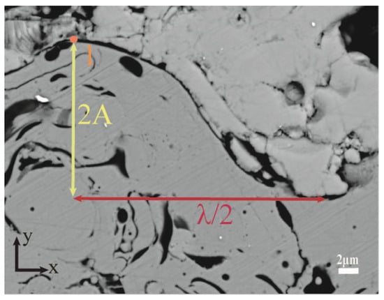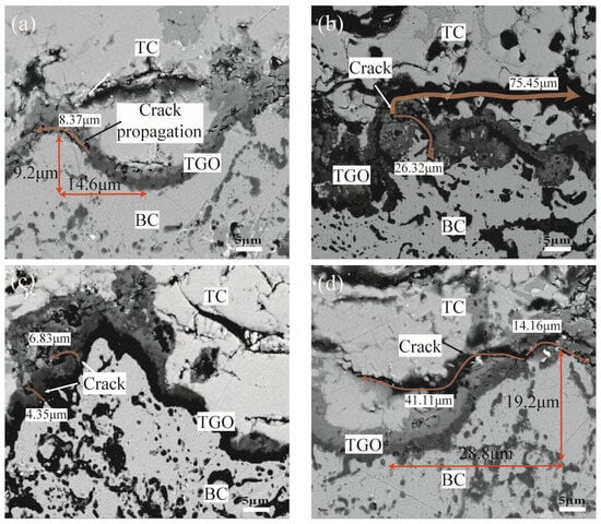 The consecutive average crack lengths were summarized and calculated using five typical SEM images in each group of samples selected for the cracks located at the TGO/BC interface location, as shown in Equation (6).