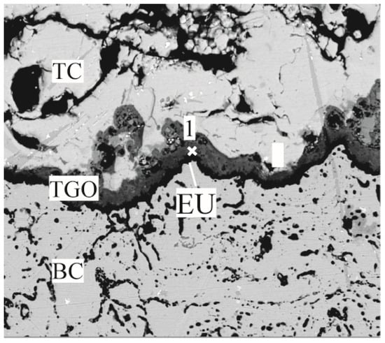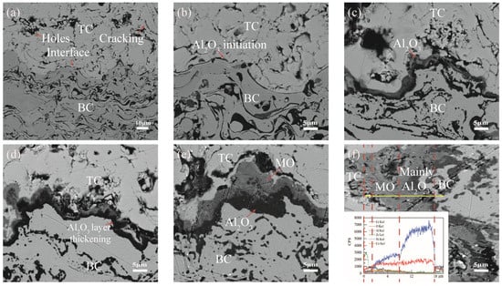 A randomly selected group (sample No.1 as an example) was analyzed for the growth of TGO layers with different numbers of thermal cycles, as shown in Figure 5. A large number of holes and microcracks were present in the ceramic layer in Figure 5a. The interface showed a cosine shape. It is obvious from Figure 5b that the α-Al2O3-dominated TGO is first formed preferentially in the peak and near-peak regions after 10 thermal cycles []. After 60 thermal cycles (Figure 5c), a dense oxide layer was generated at the interface. After 200 thermal cycles (Figure 5d), the Al2O3 thickened longitudinally, and an uneven local thickness appeared. After 340 thermal cycles (Figure 5e), a gray mixed oxide (MO) was produced in the sharp region. The rapid growth of MO (especially in the peak region) led to a further increase in interface fluctuations. After 390 thermal cycles (Figure 5f), the uneven growth led to a further increase in the thickness difference in each region, and the thickness of the peak region exceeded 10 μm. The transitional division between the mixed oxides and Al2O3 can be seen in the spectra.