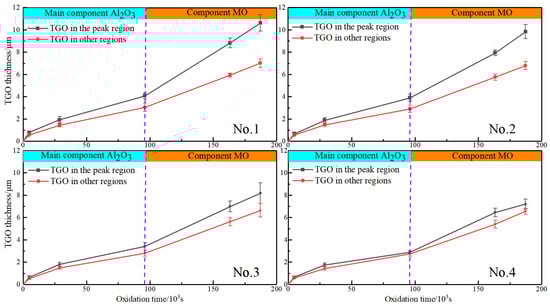 Typical areas were selected for four groups of samples experiencing different numbers of thermal cycles and the TGO thickness was measured [].
