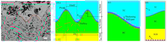 Thermal Barrier Coating (TBC) can protect critical areas such as turbine blades and combustion chambers due to its excellent resistance to high temperatures [,,]. A bonded coating (BC) and a ceramic top coat (TC) are usually applied to the surface of a high-temperature nickel-based alloy forming the TBC [,]. A dense thermally grown oxide (TGO) layer consisting mainly of Al2O3 is formed at the coating interface to protect the substrate, and its growth depends on the elemental composition of the bonding layer and the interface morphology [,,]. The interfacial mismatch stress of the coating rises further due to the thickening of the oxide layer, eventually leading to spalling or delamination during engine operation [,]. The atmospheric plasma spraying (APS) process can lead to uneven coating interface morphology. This phenomenon can seriously affect the mismatch stress of coatings during thermal cycling and thus lead to failure [,].