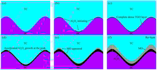 Taking No.1 as an example, Figure 8 shows the TGO dynamic growth process. The simulation process was simplified without loss of computational accuracy. The important nodes of coating TGO growth in 390 thermal cycles of the actual test process were refined into three main stages of the TGO dynamic growth model: (1) Al2O3 initial stage at the TC/BC interface (C = 1–3), as shown in Figure 8a,b. Al2O3 began to emerge from the crests and valleys when C = 2, as shown by the arrows in Figure 8b. (2) Al2O3 in the longitudinal slow growth phase at the interface (C = 4–9). At C = 4 (Figure 8c), an Al2O3 layer had formed at the interface. The uneven growth of oxides at the interface was clearly seen at C = 7 (Figure 8d). (3) Longitudinal rapid growth phase of MO (C = 10–13). MO exhibited explosive growth at C = 10 (Figure 8e). The MO in the peak region still remained fast growing at C = 13, and the maximum thickness of the oxide in the eventually peak region could reach 11 μm (Figure 8f). Figure 9 shows the final growth morphology of TGO at other interfacial curvatures.