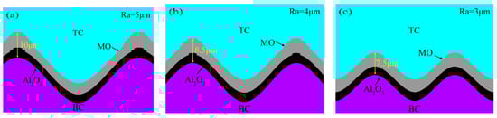 In order to analyze the effect of coating on stress under thermal cycling with different interfacial curvatures, the corresponding model was established. The model was calculated by ANSYS 21.0 software. The ideal TC/BC interface and model were built according to Figure 7a. The data in Table 2 were simplified to make it easier to construct the model. The amplitudes (A) are 10 μm, 8 μm, 6 μm, and 4 μm, and the corresponding wavelengths (λ) are 50 μm, 40 μm, 30 μm, and 20 μm, respectively. The initial model was presented in Figure 7b.