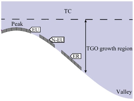 In recent years, researchers have focused on investigating the influence of interfacial morphology on TGO growth behavior, residual stress, and coating failure. Che [] et al. treated the thermal barrier coating at a constant temperature of 1050 °C and observed that the rough interface obtained under the APS process caused the growth rate of the peak region to be higher than that of the valley region in the oxide. Che [] et al. further found that the faster diffusion of Al elements led to a thicker oxide layer in the peak region at interfaces with greater roughness. Meanwhile, Ranjbar-Far [] et al. and Zhang [] et al. showed that the variability of the fluctuation amplitude can affect the size of the maximum tensile stress by studying different interfacial roughness models and samples. This indicates that the increase in roughness is a significant reason for the sudden increase in interfacial mismatch stresses.