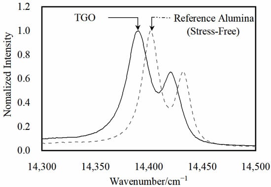 The Gaussian Lorentz function was fitted to the spectral curves by Labspec 5.0 software with an accuracy of about 0.5 cm−1. The TGO can be considered under biaxial stress due to its flat structure. Lipkin and Clarke et al. [] discussed the stress tensor of TGO in more detail. The residual stress σ is []: