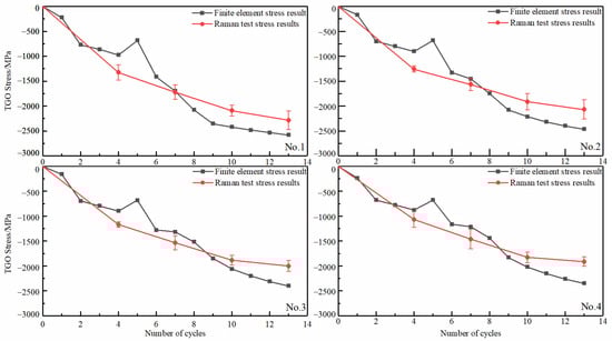 The evolution of residual stresses in the TGO peak region with different interfacial curvature was calculated and analyzed (Figure 13). As can be seen from the test results in the figure (shown as circular points in Figure 13), the increase in the number of thermal cycles increased the compressive stress in the TGO until the end. The rate of compressive stress rise was higher in the Al2O3-dominated growth phase. The presence of MO slowed the rising rate as the oxidation progressed. The TGO residual stress becomes smaller in the same number of cycles as the curvature of the interface increases. The compressive stress of No.1 can reach 2285.3 MPa after the end of the thermal cycle. However, the trend of the stresses was the same, whatever the curvature of the interface changed. The test results were consistent with the results of Xu [] and with the biaxial stress results (The biaxial stress is the sum of the principal stress vectors in both directions) for each region at room temperature in the finite element model (shown as rectangular points in Figure 13). This result can further confirm the accuracy of the model constructed based on oxidation kinetics at different interfacial curvatures.