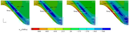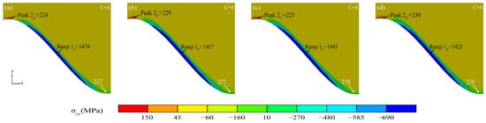 Figure 15 shows the stress diagram of the coating with a dense Al2O3 layer. A dense oxide layer gradually formed with the Al2O3 initiating and thickening. The maximum tensile stress was maintained in the peak region at the TGO/BC interface (Peak 2). However, the stress size in the peak region started to change at different interface curvatures (The no. 1 peak region had the lowest stress, and No.4 had the highest stress). The relatively even compressive stress distribution in the ramp region (Ramp 1) can protect the thermal barrier coating more effectively [].