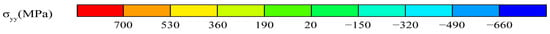 The basic characteristics of stress distribution and evolution under thermal cycling are the prerequisites for understanding the behavior of crack initiation and propagation. The appearance of interfacial cracks is the fundamental reason for the coating’s localized spalling [,]. The normal stress σyy is the main cause of crack initiation. Therefore, the stress analysis in this research was focused on the normal stress σyy.