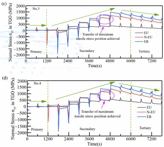 In order to clarify the effect of TGO growth behavior on the distribution and size of coating stresses at different interfacial curvatures, the stresses (σyy) in typical regions with a different number of thermal cycles were extracted and compared for four samples, as shown in Figure 19. Taking No.1 as an example, the hazardous loads at the TGO/BC interface were mainly concentrated in the EU (near the peak region and the ramp region where the tensile stress was close to 0) at the end moment of the first stage of cooling. Large tensile stress (MAX:+201 MPa) existed in the N-EU firstly in the holding state, and the area of dangerous stresses during the holding period began to be transferred in the second stage. The tensile stresses in the three typical regions continuously increased, especially in the ER (the maximum tensile stress existed during the 8th cycle of holding) with the oxidation process. The tensile stresses in N-EU and ER first exceed EU under the cooling phase, completing the region transfer of dangerous stresses under the whole process after entering the 9th thermal cycle (as shown in the pink circular box in Figure 19a). The tensile stress in the typical regions started to decrease with the rapid growth of MO. The dangerous stress transfer phenomenon in the process was over (the tensile stresses in N-EU and ER decreased rapidly below EU in the cooling stage) at the 13th cycle, and the dangerous loads were mainly concentrated in ER, as shown in the green circular box in Figure 19a.