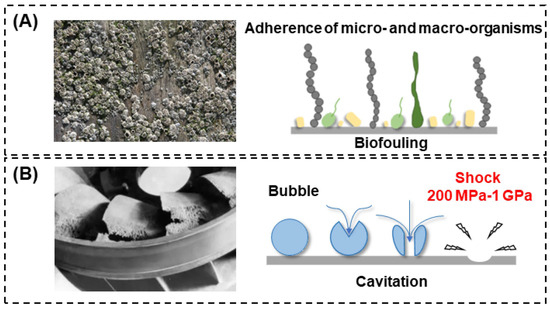Figure 1. Ship propeller biofouling and cavitation erosion phenomenon and its mechanism diagram. (A) The phenomenon of marine biofouling and its mechanism; (B) The phenomenon of cavitation erosion and its mechanisms.