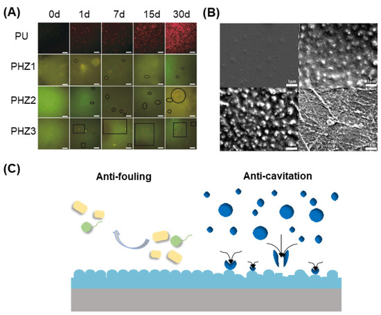 Figure 7. (A) Fluorescence microscope images of algae on PU, PHZ1, PHZ2, and PHZ3 coatings at different immersion times with a scale of 50 μm [99] with permission (Copyright © 2023, Elsevier); (B) SEM image of the microstructure of polyurethane-coated SFPU-x surface with a scale bar of 1 μm [100] with permission (Copyright © 2023, Elsevier); (C) Mechanism of antifouling and anti-cavitation of microphase separation structure.