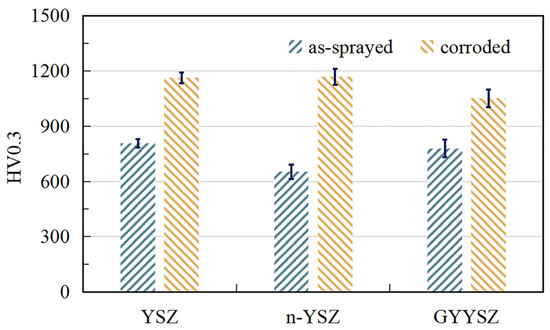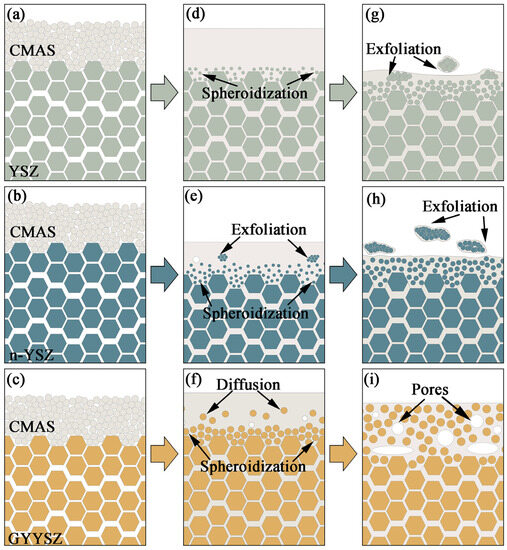 - Decreased porosity and increased microhardness are found in all three coatings after CMAS corrosion. The increase in microhardness of n-YSZ coatings is more pronounced than that of YSZ coatings, while that of GYYSZ coatings is relatively small.