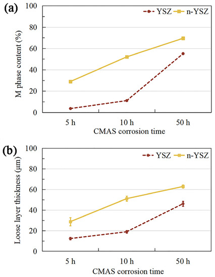 - Loose layers consisting of fine spherical m-ZrO2 particles are formed in both corroded n-YSZ and YSZ coatings. The thickness of loose layers and the degree of phase transition in the coatings increase with corrosion time. More pronounced phase transition and earlier spalling are observed in n-YSZ coatings compared with YSZ coatings.