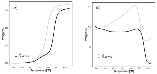 Figure 6 presents the TGA results indicating the thermal stability of MPs before and after modification by APTES under air (a) and nitrogen (b) flows. In the air atmosphere, MP curves show an increase in weight during heating due to the oxidation of CI to ferric oxide [50]. The total weight increased by 33.5% for CI and 31% for CI-APTES. The weight of CI particles started to increase significantly at approximately 350 °C, while the sharp weight increase for CI-APTES began at 500 °C. This temperature shift showed a higher resistance to oxidation in MPs modified, which could be attributed to the APTES layer. This layer plays the role of a barrier limiting the exposure of MPs to oxygen by forming a shell around the surface of MPs [51]. Under the nitrogen flow, the weight of the MPs slightly decreased at 650 °C. For the CI particles, the weight increased (1.1%) up to 450 °C, which could be attributed to possible oxidation since the nitrogen flow or the CI may still contain impurities. Over 500 °C, the weight of CI slightly decreased. However, the weight of CI-APTES showed a steady trend up to 500 °C due to its oxidation resistance. Beyond this temperature, MPs’ degradation started, leading to an eventual slight weight loss [52]. Total weight loss for CI-APTES was around 1.9%, while for CI, the loss was about 0.5%.