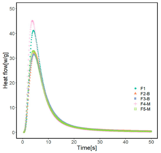 Photo-DSC was used to monitor the photopolymerization behavior of UV-curable acrylate formulations containing various concentrations of MPs. Table 2 and Figure 7 present the results of photo-DSC measurements, and Figure 8 illustrates the conversion of formulations. According to the measurement results, the heat flow enthalpy () and conversion (α) remain approximately constant with increasing MP content in the formulation.