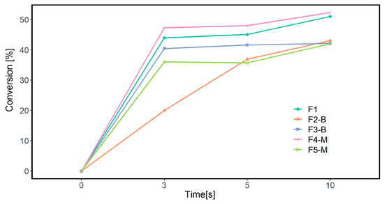 Conversion rate of reference formulation (F1) and formulations prepared with 3 and 5% wt. of MPs before and after modification calculated from Photo-DCS results.