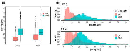 The boxplots and histograms presented in Figure 10 demonstrate the arrangement of MPs in the polymer matrix and the distance between them in the form of free path spacing between adjacent MPs. The box plots represent the average distance between MPs in F2-B and F4-M formulations. The modified MPs exhibited a slightly greater average free path spacing compared to the bare MPs. This can be attributed to the surface functionalization process of the MPs treated with APTES reducing the tendency to aggregate, which leads to a better distribution of MPs in the cured film. Amino functional groups of the APTES enhanced the compatibility and interfacial interactions between the modified MPs and the polymer matrix [38,55]. This improved dispersion can also be seen in the histograms of both samples at 0 mT, where the spacing distribution for modified MPs shows two populations, with the latest located at higher values than for bare MPs.