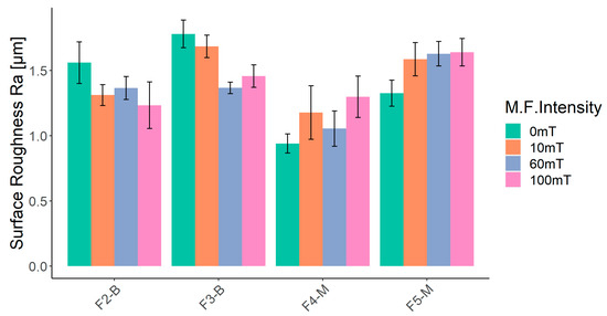 The surface roughness (Ra) of four formulations (F2-B, F3-B, F4-M, and F5-M) cured on a glass substrate is presented in Figure 13. The leftmost column for each formulation represents the UV-cured samples without a magnetic field (0 mT), while the three other columns represent the UV-MF samples at 10, 60, and 100 mT, respectively. In the absence of a magnetic field (0 mT), UV-cured films of CI (F2-B and F3-B) are rougher than UV-cured CI-APTES films (F4-M and F5-M) due to the higher agglomeration of non-modified particles and the higher presence of MPs at the surface. In the CI-APTES formulations (F4-M and F5-M), the modified MPs are more evenly distributed in the volume of the base formulation, which consequently leads to lower roughness [58]. As shown in Figure 13, the F4-M sample (3 wt.% CI-APTES) shows an increase in surface roughness once the magnetic field is applied. At 0 mT, surface roughness was 0.95 µm, and then there was an increase in the roughness of the UV-MF films. Ra values were measured to be 1.18, 1.05, and 1.29 µm for the MF intensities of 10, 60, and 100 mT, respectively. However, the obtained standard deviations do not allow for differentiation between the roughness measurements of samples at the three MF intensities. For the F5-M sample (5 wt.% CI-APTES), the roughness obtained at 0, 10, 60, and 100 mT was higher than that for F4-M (3 wt.% CI-APTES). In fact, the addition of higher quantities of particles increases the film’s surface roughness. Finally, the F5-M sample clearly demonstrated that the intensity of the applied magnetic field (10, 60, or 100 mT) had no impact on the final surface roughness. Ra values were recorded as 1.58, 1.62, and 1.63 µm, respectively. For the F2-B and F3-B samples, the surface roughness was higher without a magnetic field (0 mT) compared to the UV-MF films with 10, 60, and 100 mT. In fact, the MPs, including the agglomerated ones, redistributed within the film when the magnetic field was applied, resulting in rearrangement and the formation of vertical particle chains. Therefore, the surface roughness decreased with increasing magnetic intensity. As the magnetic flux increased, more agglomerated and surface MPs transformed into particle chains and aligned themselves with the magnetic flux.