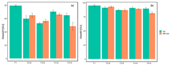 Results of gloss measurements at (a) 20° and (b) 60° for samples cured with the absence/presence of magnetic field.