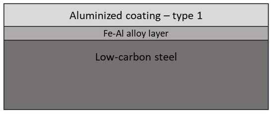 Schematic of an aluminized steel cross-section showing the coating layer and the substrate. The aluminum coating was applied by hot-dipping of low-carbon steel. These coupons were manufactured by AK steel.