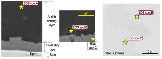 Figure 3 presents three cross-sectional locations in type-1 aluminized steel and five spots in the cross-sections selected for EDS composition analysis. The left image exhibits Al-rich coating and Fe-Al alloy layer on the steel substrate, while another location of Al coating and Fe-Al alloy layer is shown in the center image. A random location within the steel substrate in the right image was also selected for EDS spot analysis. The mass percents of the five spots, from EDS data, are summarized in Table 2. Spot A within the bulk coating area contained 2 wt.% Si, while spot B adjacent to the alloy layer showed much higher Si content (~38 wt.%) along with moderate Fe content (~5 wt.%). The mole ratio of Fe and Al in spot C is approximately 1:4. Based on information in a previous report, the alloy layer is presumed to be a mixture of Fe2Al5 and Fe4Al13 [27]. Spots D and E in the steel substrate of the right image revealed ~2 wt.% Co and varied amounts of Ti and Ni.