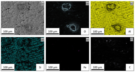 Figure 6 presents a cross-sectional SEM image and associated elemental mappings of aluminized steel after 500 h immersion in 65,000 Btu/h. The images show a region where the Al-Si layer was damaged by pitting corrosion. The absence of Al and Si along the pitting attack is shown in Figure 6c,d. The pitting corrosion damage to Al-Si layer was deep enough to expose the steel substrate as seen in Figure 6e. On the SEM/EDS plan view observation presented in Figure A2 in Appendix A, oxygen was present on both Al-rich coated and Fe-rich welded surfaces, implying that corrosion occurred not only on Al-Si layer, but also on welded regions.