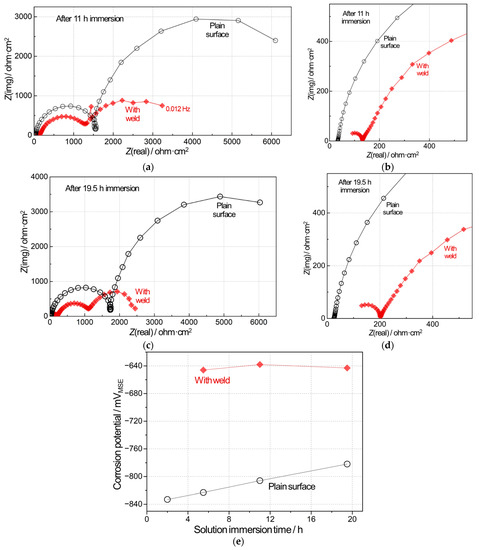 Electrochemical data of plain and with-weld aluminized steel surfaces in 65K Btu solution. Impedance plots after (a,b) 11 h and (c,d) 19.5 h immersion. (b,d) Impedance data in smaller x and y scales. Note that with-weld data in (a) were plotted to 0.012 Hz due to low-frequency noise. The low frequency of the other impedance data was 0.005 Hz. (e) The corrosion potential values associated with impedance measurements.