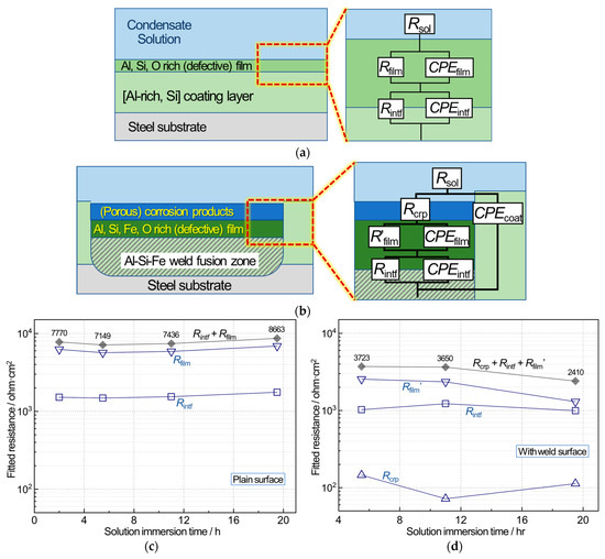 Equivalent circuit models illustrated in schematic cross-sections of (a) plain and (b) with-weld surfaces. Rsol: solution resistance, Rfilm and R’film: defective film resistances, Rintf: interface resistance underneath the defective films, and Rcrp: corrosion product resistance. CPEfilm, CPEintf, and CPEcoat: constant phase elements associated with the defective film, interface, and [Al-rich, Si] coating layer. All resistance data in (c,d) were from the fitting results with Chi-square lower than 0.00089.