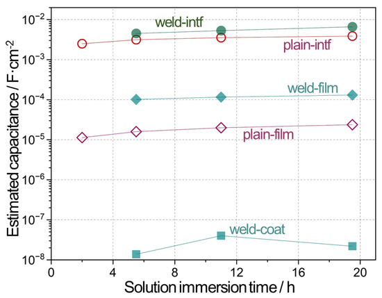 The estimated capacitance values of plain and with-weld surfaces are plotted as a function of immersion time in Figure 9. The interface capacitances were not significantly different between the plain and with-weld surfaces, while the film capacitances were greater in the with-weld case. The discrepancy of film capacitance could be attributed to film permittivity and thickness that must have been different between the two samples. For the plain and with-weld samples, the interface capacitances were greater than the film capacitances (>1 order). Similar to these results, smaller film capacitances were previously reported in type-2 aluminized steel corroding in a neutral electrolyte simulating natural water [32]. The coating capacitance associated with the layer away from the weld was the smallest among the estimated capacitances. This is probably because the major portion of charged species transfer during corrosion occurred within the welded region; therefore, only a small portion of charged species would participate in the capacitive behavior of the non-welded coating layer.