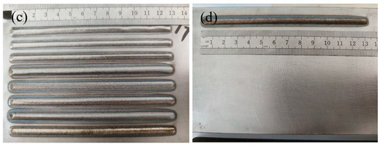 Macroscopic morphology of laser cladding. (a) The macro morphology of cladding layer of experiment 1–8; (b) the macro morphology of cladding layers of experiment 9–16; (c) the macro morphology of cladding layer of experiment 17–24; (d) the macro morphology of cladding layer of experiment 25.