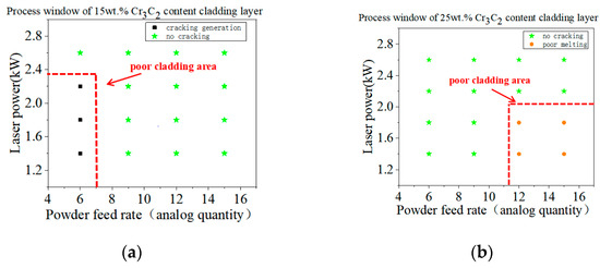 By selecting the 15 wt.% and 25 wt.% Cr3C2 contents, which have a smaller tendency to generate cracks in the previous text, we obtain process windows where there are no obvious macroscopic cracks on the surface of the cladding layer at a scanning rate of 0.002 m/s, as shown in Figure 10.
