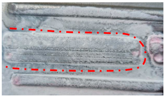 In the obtained process window, we selected parameters to prepare a large area of crack-free coating. Process parameters that led to fewer cracks and better forming were determined: Cr3C2 content of 25 wt.%, laser power of 1.8 kW, laser scanning speed of 0.002 m/s, and powder feed rate of 6. The laser scanning route adopts an s-shaped path, where the starting point of each pass is the endpoint of the previous pass. The final prepared multilayer overlap fusion coating is shown in Figure 11. It can be seen that the surface of the cladding layer prepared under this process and the Cr3C2 content is bright and flat, with good formation. After penetration testing, there are no macroscopic cracks on the surface.