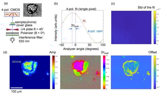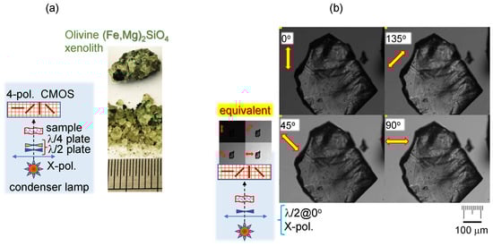 Kamegaki, S.; Smith, D.; Ryu, M.; Ng, S.H.; Huang, H.-H.; Maasoumi, P.; Vongsvivut, J.; Moraru, D.; Katkus, T.; Juodkazis, S.; et al. Four-Polarisation Camera for Anisotropy Mapping at Three Orientations: Micro-Grain of Olivine. Coatings 2023, 13, 1640. https://doi.org/10.3390/coatings13091640