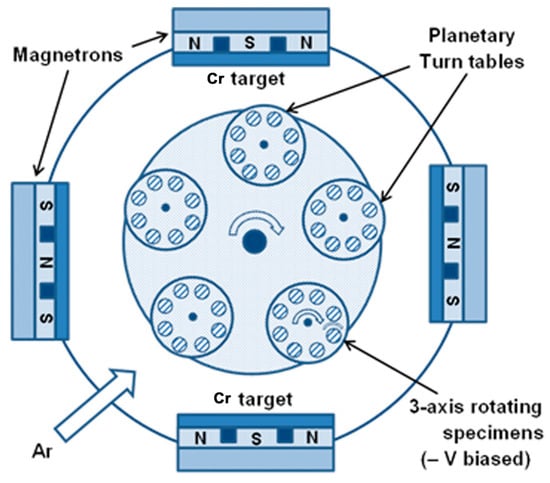 Chromium coating was conducted by the Canadian National Research Council (NRC) in an unbalanced closed-field magnetron sputtering (UMS) physical vapor-deposition (PVD) coater (Teer 650) (see Figure 2). Argon was used as a working gas to produce plasma for metal-target sputtering. A chromium target of more than 99.5% purity was used. The deposition chamber was depressurized to below 7 × 10−3 Pa (5 × 10−5 Torr) before the introduction of the working gas. The samples were cleaned with isopropyl alcohol prior to insertion into the chamber. The planetary turning tables were rotated in the x–y–z directions during deposition, resulting in a uniform coating on the sample surfaces. A direct current (DC) of 6 A was applied to the target. A pulsed DC bias voltage of −40 V was applied to the substrate. The deposition rate was determined to be about 2.46 µm/h.