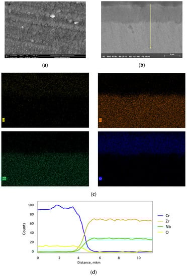 A scanning electron microscopy (SEM) picture of the as-deposited Cr coating on the Zr-2.5Nb substrate is shown in Figure 3a. It can be seen that the Cr coating was uniformly deposited as a dense layer onto the Zr-2.5Nb substrate. The energy dispersive spectroscopy (EDS) results from the line scan shown in Figure 3b illustrate that the Cr weight ratio accounted for the majority of the coating and the substrate had Zr and Nb as the main elements. The oxygen signal within the chromium layer (yellow line in Figure 3b) was notable and uniform suggesting incorporation of oxygen during the coating process. According to the cross-sectional SEM micrographs and EDS analysis, the thickness of the as-deposited Cr coating on the Zr-2.5Nb substrate was about 5 μm.