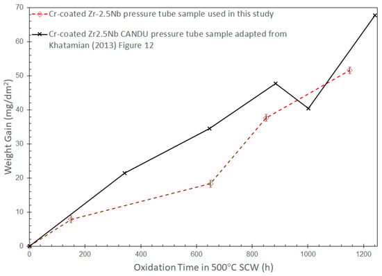 Previous experimental results on Cr-coated coupons exposed to 500 °C and 30 MPa of pure D2O by Khatamian [8] are included in the figure for comparison. In his experiments, Zr-2.5Nb was obtained from a 1 mm thick sheet supplied by ATI-Wah Chang, Albany. It was cold-rolled and annealed at 650 °C. It is important to note that a static autoclave was used by Khatamian. At a similar temperature, Cr-coated samples show similar weight gains. The weight gains differ within a factor of two at 650 h exposure; the weight gains of the coated specimen in the current study and the value obtained from Khatamian’s work are 18 and 35 mg/dm2, respectively.