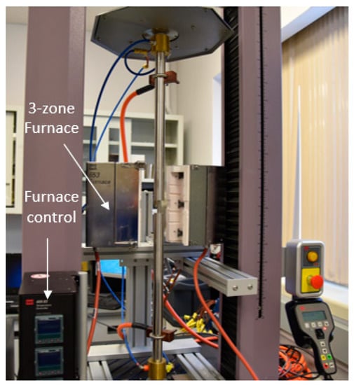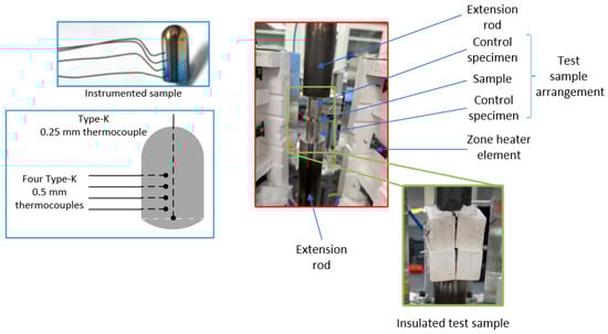 An apparatus was developed to measure the thermal conductivity of the coated samples, where the surface coating may be intentionally deposited on the sample to achieve a desired outcome or may be due to uncontrolled processes, such as oxidation. The thermal conductivity apparatus used for the present investigations adopted the Divided Bar methodology, with several modifications implemented to accommodate the nature of the specimen in the investigation. The apparatus is shown in Figure 7 and the setup for the test sample is shown in Figure 8. The apparatus consists of a 5 kN load bar connected to a furnace that has three independently heated zones capable of reaching 800 °C in each zone. The test sample arrangement comprises two control specimens, which have a known thermal conductivity, that sandwich the sample for which the thermal conductivity is being measured. The load is transferred to the test sample arrangement through extension rods to provide good contact at the interfaces between the three components of the test sample arrangement. The contact between the components is also further improved by using high-conductivity boron nitride paste at these interfaces. Using the three-zone furnace, a temperature gradient is imposed on the test sample arrangement. The three-zone furnace is also used to set a higher ambient environment, which reduces the heat loss from the test sample arrangement. The heat loss is further reduced by insulating the test sample arrangement with a porous 0.85 wt% alumina–silica composite (shown in Figure 7) and wrapped in alumina wool to insulate the gaps for the thermocouple penetration. Each control specimen is instrumented with five thermocouples in series to measure the heat flow and capture the rate of radial heat loss from the insulated test sample arrangement. The thermocouples are spaced 3 mm apart.