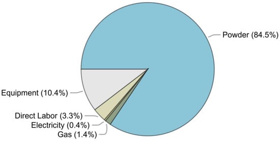 where is the cost of powder used per 1 kg of coating deposited, is the cost of gas used for depositing 1 kg of material, is the electricity cost per unit mass of coating, is the labor cost per unit mass of coating, and is the equipment cost allocated to the deposition of 1 kg of material [22,24,25,26,27,28]. In the present study, the second method is used, since less information is required [22,24,25]. In addition, this aspect is important because the primary data source for estimating a vacuum plasma [21] used both costing methods for providing cost estimates, but did not provide the methodology, nor the full assumptions or clarity on using some of the data provided.
