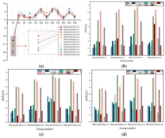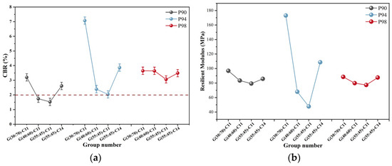 Since there is a prediction model between CBR and resilient modulus, it is clear from Figure 3 that the trend for both variables is consistent. CBR can be used to predict the bigness or smallness of the resilient modulus [36]. In this study, with the same geopolymer amount, the CBR and resilience modulus of GSP declined as the FA content in the geopolymer increased. The GSP performed the best when the FA to GBFS ratio is 30:70 in geopolymer. The highest CBR and resilient modulus are found in the P94-G(30:70)-C11, reaching 7.07% and 173.06 MPa, respectively. These values are 3.47 times the CBR and 3.6 times the resilient modulus of the P94-G(55:45)-C11, respectively. At this time, the capacity to resist vertical deformation during the elastic deformation stage is stronger and can support higher loads when the material has solidified. When the amount of alkali-activator is raised from 11% to 14%, the CBR and resilient modulus of GSP are also somewhat increased. The addition of 3% alkali-activator raises the CBR by 90% and the resilient modulus by 127% when the content of PG is 94%. In addition, Figure 3 demonstrates that the CBR and resilient modulus do not diminish as the curing agent content in the GSP sample decreases. Due to the poor mechanical properties of PG, the capacity of ordinary soil foundation to resist load or deformation gets poorer as PG content increases [13]. However, we can see that the impact of various geopolymer proportions on the CBR steadily diminishes when the PG content approaches 98%. The maximum resilient modulus is 1.14 times greater than the minimum resilient modulus, and the highest CBR is 1.19 times greater than the minimum CBR in the four groups. This is sufficient evidence to demonstrate that, as PG content reaches 98%, the influence of the geopolymer on GSP is no longer immediately obvious due to the geopolymer′s low content. In conclusion, the CBR of GSP samples in the other groups, except P90-G(55:45)-C11 and P90-G(40:60)-C11, is between 2% and 8%, which satisfies the minimum CBR standard value of roadbed filler in JTG/T 3610-2019 [37].