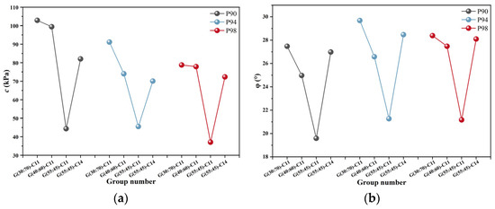 Figure 5 shows that, for GSP with the same PG content, the cohesive force and internal friction angle decrease as the amount of FA in the geopolymer increases. When FA:GBFS = 30:70, the cohesive force and internal friction angle of GSP achieve their highest values. The cohesive force reaches its maximum value of 102.8 kPa when the content of PG is 90%, and the internal friction angle reaches its maximum value of 30° when the content of PG is 94%. The G(55:45)-C11 group has an internal friction angle above 18° and a cohesive force below 50 kPa; it currently belongs to a weak structural plane. In contrast, all other groups of GSP, with the exception of G(55:45)-C11 group, have cohesive force values of at least 70 kPa and internal friction angles of at least 18°, all of which belong to rigid structural planes. Particularly, the cohesive force and internal friction angle of P94-G(30:70)-C11 can approach 90 kPa and 30°, respectively, showing that their structural surfaces have a good level of adhesion. When FA: GSP = 30:70 is used, the GSP exhibits greater performance of shear strength, meaning that when it is exposed to external shear pressures, its capacity to resist damage and deformation is strongest. In addition, it can be seen from the figure that adding more alkali-activator also improves the shear resistance of GSP, increasing the cohesive force by nearly two times, which makes the stabilized GSP change from a weak structural plane to a hard structural plane.