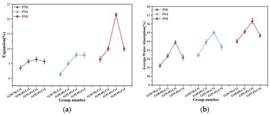 The hydrophilic property of PG is well known [14]. The sample of GSP has a certain number and size of pores. After soaking, water can enter the interior of the GSP sample through the pores. This will cause GSP to gradually lose its mechanical properties as well as cause deformation and cracking. The sample of GSP will eventually collapse when its mechanical properties decrease to a specific point until they becomes loose from loss of resistance in the water. The higher the water absorption during the soaking process of GSP, the larger the expansion. Figure 6 shows that the expansion and average water absorption of Group G(30:70)-C11 are the lowest, whereas they are the opposite for those in Group G(55:45)-C11, showing that Group G(30:70)-C11 has the best anti-expansion performance and the strongest resistance to water erosion. The P94-G(30:70)-C11, which possesses the best mechanical qualities, also exhibits the lowest expansion and average water absorption, with values of only 1.39% and 12.4%, respectively. This shows that the stronger the ability to resist deformation after soaking, the better the bonding and structural compactness of the interface in GSP. As can be seen, with the same amount of PG, the expansion and average water absorption increase as the mass percentage of FA in the geopolymer gradually rises. The G(30:70)-C11 group with stronger mechanical properties has the strongest resistance to water erosion and may retain a certain volume stability in water. At the same time, we can observe that the expansion and water absorption of GSP increase with the higher content of PG. The average water absorption and expansion of GSP is higher when the PG content is up to 98% than when it is 90% or 94%. For example, the expansion of P98-G(30:70)-C11 is 4.6 times that of P94-G(30:70)-C11, and the water absorption increases by about 13%. Figure 6 shows that adding more alkali-activatorF to GSP enhances not only its mechanical properties but also its volume stability in water. The expansion of the P98-G(55:45)-C14 decreased by almost 54% when compared to the P98-G(55:45)-C11, and the water absorption is decreased by 11% with a 3% increase in alkali-activator.