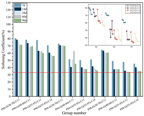 It is clear from Figure 7 that, as the PG content rises, the GSP′s softening coefficient falls. The softening coefficient of GSP with 90% PG content is high, and after soaking in water for 7 d, the softening coefficient of P90-G (30:70)-C11 is 80.5%. The softening coefficient of GSP samples with 94% and 98% PG content reduced dramatically when compared to that of GSP samples with 90% PG content, particularly for the group with a higher FA amount, where the softening coefficient of P98-G(55:45)-C11 decreased by about 40% when compared to P90-G(55:45)-C11. When the PG content is increased, the softening coefficient of GSP in group G(30:70)-C11 decreases, but it usually remains steady, outperforming other groups. Oddly, the softening coefficient of GSP did not increase with the addition of a little alkalin-activator. Each group of GSP samples′ softening coefficient also steadily decreases with soaking time, and the GSP softening coefficient rapidly declines between 7 and 14 d. After 14 d, the rate of softening coefficient decrease slows, and after 60 d the softening coefficient tends to stabilize. It is clear that the soaking has a considerable effect on the UCS of GSP samples between the ages of 7 and 14 d, but that effect is much less obvious after that period. This might be because GSPs lose strength quickly when in contact with water in the early stages, but the speed of strength loss does not increase with soaking time, which is sufficient to demonstrate their capacity to maintain their mechanical properties even after prolonged soaking. At each soaking period of the experiment, no looseness was discovered in the GSP samples.
