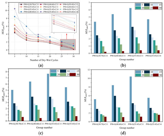Place the samples in water when it has been stabilized to a steady strength (60 d). Before soaking in water, weigh each sample and record its mass as . After soaking it in water, weigh it every three days and record the result as until the mass remained stable. Then, The average water absorption after soaking is − ; using Equation (5), the Mass loss rate () can be calculated.