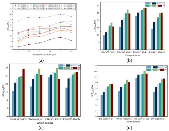 A higher water absorption and expansion will limit the overall durability of GSP as a roadbed filler. This is because, in practical engineering applications, GSP as a roadbed filler will encounter scenarios such as heavy rain erosion and alternation of wetting and drying, etc. Through the aforementioned research on mechanical properties, we know that, when GSP has a higher water absorption and expansion capacity, its mechanical properties are lower, without experiencing environmental changes. We believe that the low mechanical properties of GSP are due to the decrease in its overall porosity. When experiencing changes in the external environment, such as water erosion, a higher water absorption and expansion will gradually increase the porosity of GSP. This process is not recoverable. That is to say, high porosity will make GSP less resistant to water erosion, and water erosion will gradually increase the porosity of GSP. This is a mutually reinforcing process. A completed road usually needs to be used for more than a year, which means that over time the potential frequency of experiencing heavy rain erosion increases. This will break up its long-term performance.