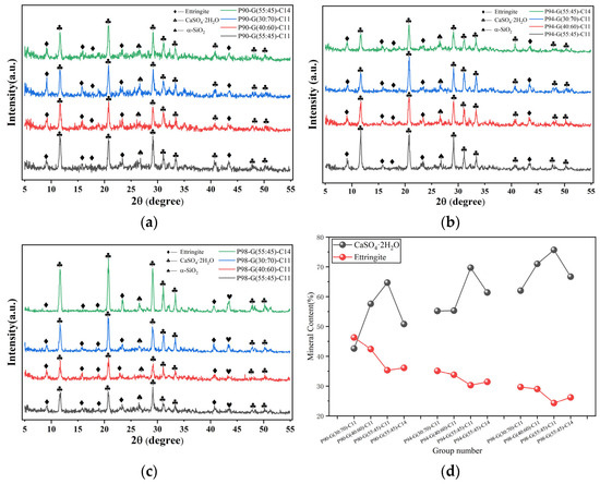 The alkali-activator also affects the mechanical properties of GSP. The overall mechanical properties of GSP are improved when the amount of alkali-activator is properly increased in a certain range. The primary function of the alkali-activator in GSP is to control the pH of the hydration environment. The pH of the GSP hydration environment will affects the solubility of PG and the rate of the hydration process [9]. For one thing, the disadvantage of PG′s low solubility is much more obvious at low pH. The mechanical properties and water stability of GSP are significantly impacted by PG′s low solubility. The lower the pH value, the lower the solubility of PG, and the more PG dissolves. As PG dissolves, soluble phosphorus, fluorine, and heavy metal ions in PG will overflow. At the same time, it will further reduce the pH value of the hydration environment of GSP. Therefore, the solubility of PG can be improved by increasing the amount of alkali-activator, which can further improve the pH value of the hydration environment of GSP [9]. In addition, the alkali-activator also provides a small amount of silicon source, and the improvement of silicon source is conducive to promoting the formation of C-S-H, C-A-S-H, and N-A-S-H in GSP [42]. Furthermore, it can promote the precipitation of ettringite. The formation of these hydration products is beneficial for the mechanical properties of GSP.