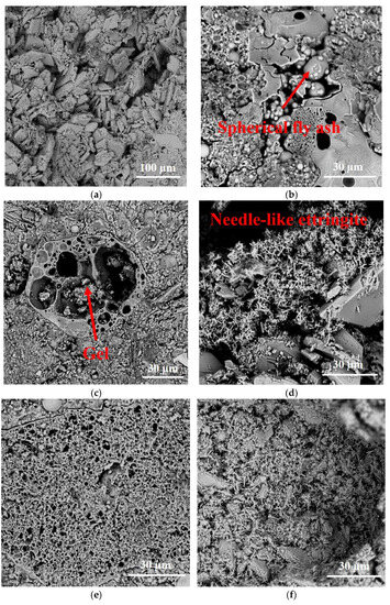 Firstly, it is clear from the SEM of GSP (Figure 12) that the GSP′s physical mechanical properties gradually become completely developed. This strength growth is mostly attributable to the initial cation exchange and flocculation inside the GSP matrix, as well as the cementation between non-reacting particles and the gelling compound during the curing process [56]. From the observation of the micromorphology of GSP, the presence of cementation products was found. The primary and secondary cementation products generated by hydration reactions are primarily responsible for the early and long-term strength development of GSP [57]. The size and number of pores in GSP are nearly constant under identical physical conditions, and hence the yield of cementation products (i.e., CSH, CAH, and Aft) has the biggest impact on the strength development.